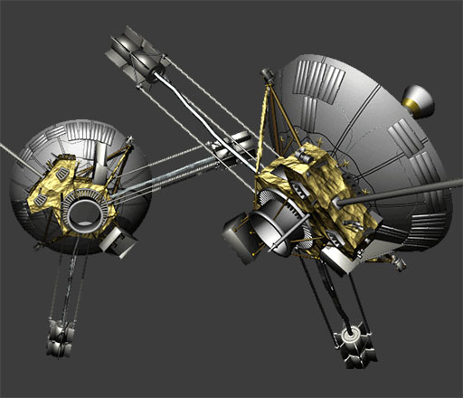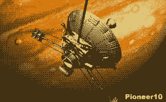 2004年 5月23日(日) CG〔Pioneer10号〕 LightWave3Dでモデリングしました。NASAが打ち上げたアトラスロケットに搭載された惑星探査機です。木星でフライバイし、太陽系外へ飛び出し、アルデバラン方向へ飛行中だそうです。 木星付近でPioneer10号が回転して飛んでいたらこんな感じ……というGIFアニメです。
