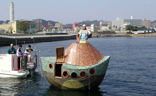 太陽丸進水式にて、上部ハッチを開けて現れた日比野氏。自力航行はできないので他の船に曳航されるのだが、船の重心が高いこともあってか不安定な動きに見えた。