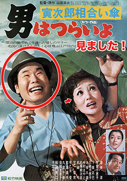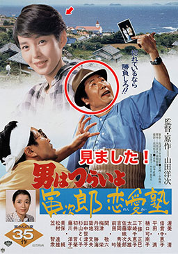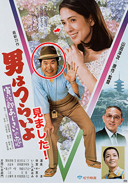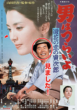 あと一歩が足りない寅さん。いつもより数段上の寂しい旅立ちとなりました。前回バイクに乗っていたさくらさんでしたが、自転車にもどっていました。柴又小学校、寅さんの同級生として、大工の棟梁・茂(犬塚弘)、クリーニング屋の安男(東八郎)、柳(前田武彦)、すみ子(小桜京子)が出ていて、光枝さんの亭主役で小沢昭一さん、旅館でひげを剃る客の役で関敬六さんなど豪華なキャストでした。冷蔵ショーケースの「★サッポロビール」は今回も隠されていて、冬はおでんの仕込みに使われていました。今回の谷さんは秋月は旅館〔沖吉〕の仲居さんでした。