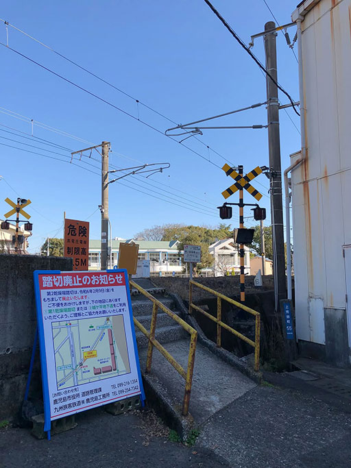 令和6年2月9日(金)で廃止という看板です。線路が緩やかなカーブを描いているこのあたり、たまに、撮り鉄の男子がこの第2乾燥場踏切でカメラを構えています。第2乾燥場踏切の名称は、その昔、タバコの葉を乾燥する専売公社の工場が近くにあったのでこの名前がついています。その工場、今はすこし離れたところにあり〈TSネットワーク株式会社 鹿児島流通センター〉という名称です。