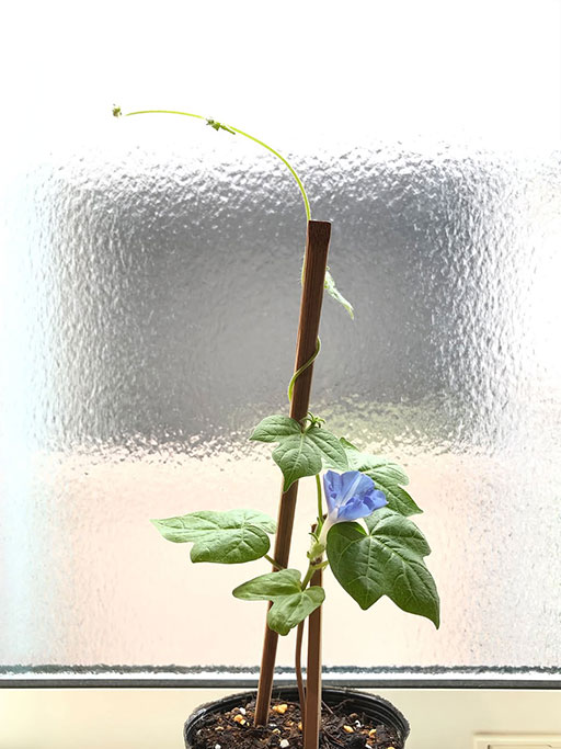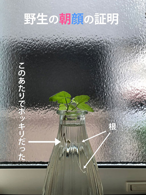 去年、道端の野生の朝顔のタネを採っていました。先日タネを苗ポットに植えましたが、双葉が出た頃、強い風で根元からポッキリ折れてしまいました。あれ〜と思いながらも折れた朝顔を小さめの花瓶に挿して様子をみることにしました。数日たちますが、枯れずに元気でした。そしていつの間にか本葉も出てきて、さらには根も急成長していてびっくり仰天です。
