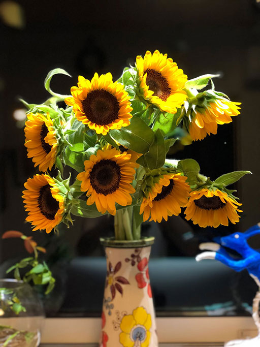 夏は、やはり、ひまわりだと思うので、すこし贅沢して、生花を買ってみました。暑いこともあると思いますが水をよく吸いました。朝方、水をいっぱい入れても夕方には六分目ほどになっているほどです。いやいやしかし驚くほどリッチな気分です。